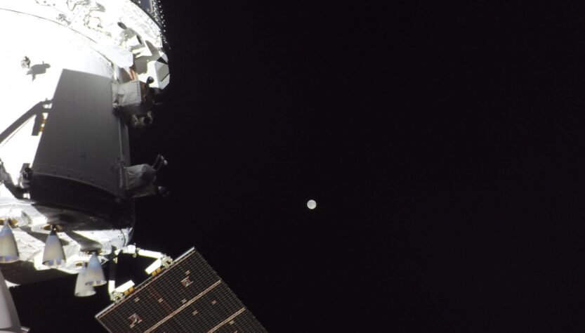 La Agencia Espacial Europea captó a la nave Orión a unos 183,936 kilómetros de la Tierra y a unos 244,298 kilómetros de la Luna a las 23:00 horas del sábado.