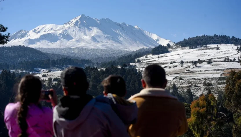 Ciudad De México, 01 de abril de 2026.- La madrugada del martes 31 de marzo de 2026, los volcanes Popocatépetl, Iztaccíhuatl y Xinantécatl (Nevado de Toluca), ubicados en el Estado de México, se cubrieron de una capa de nieve. Ante la afluencia de visitantes por este fenómeno natural, las autoridades estatales implementaron el operativo Paliacate en la zona de Don Goyo y la Mujer Dormida para mantener vigilancia.
